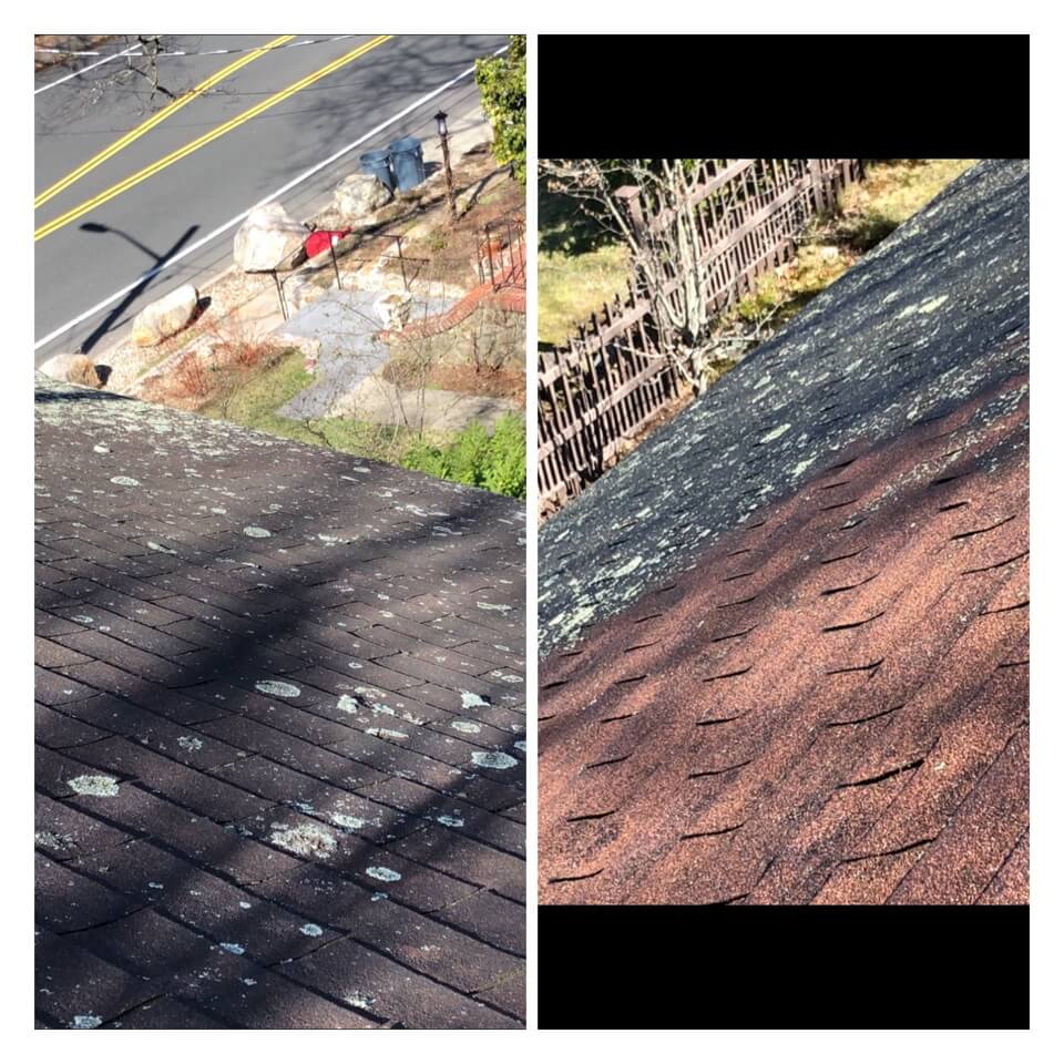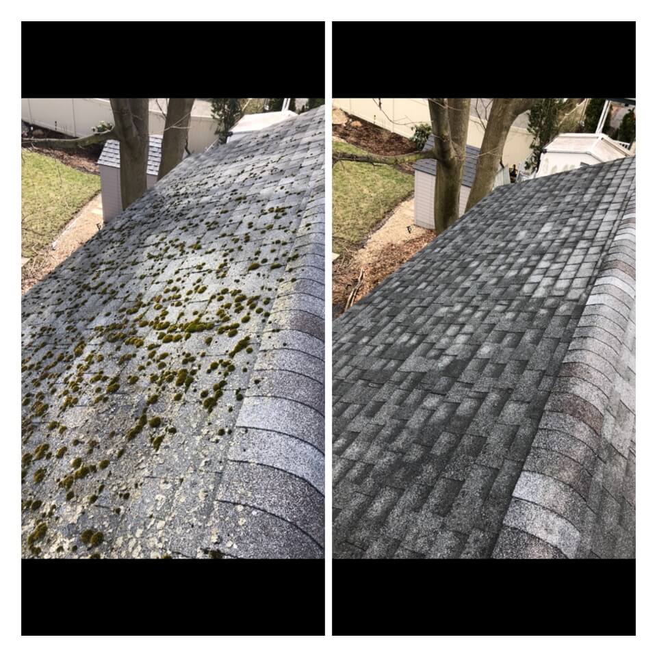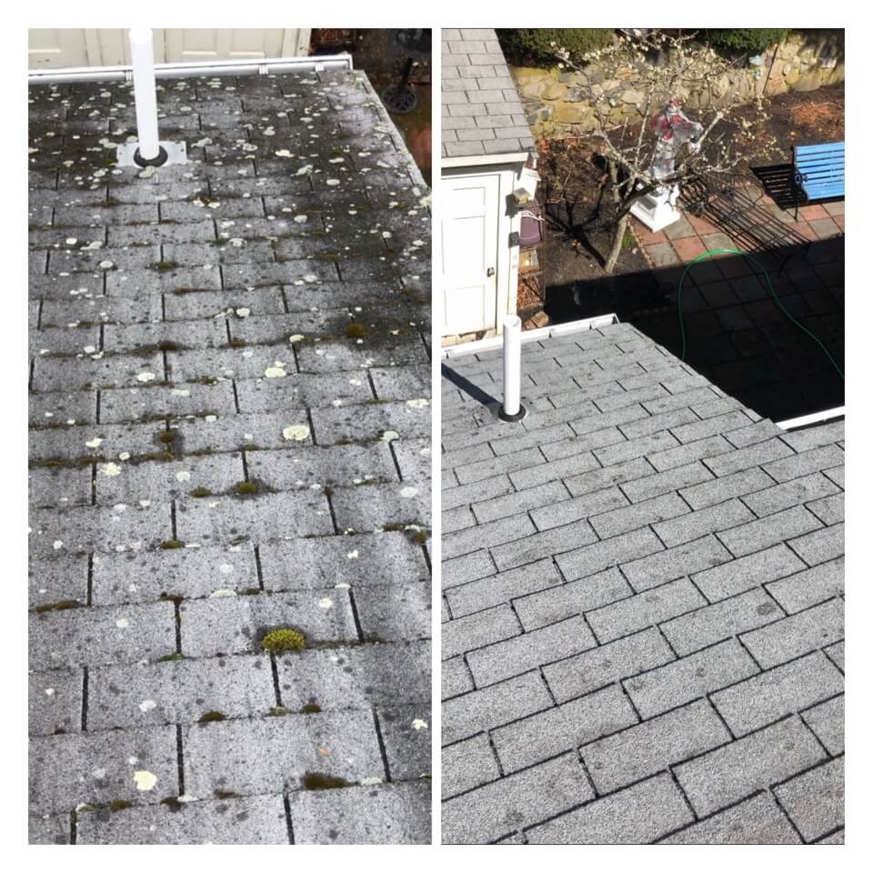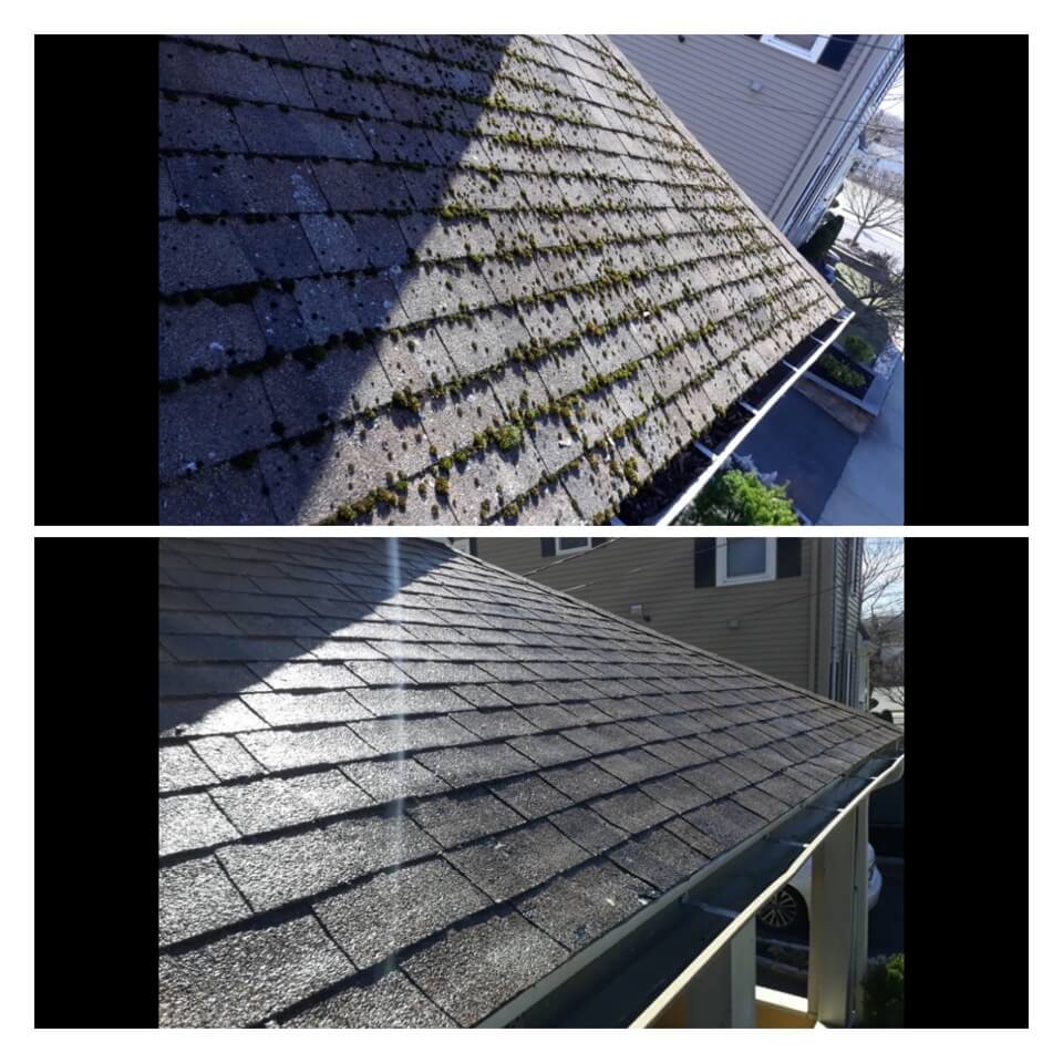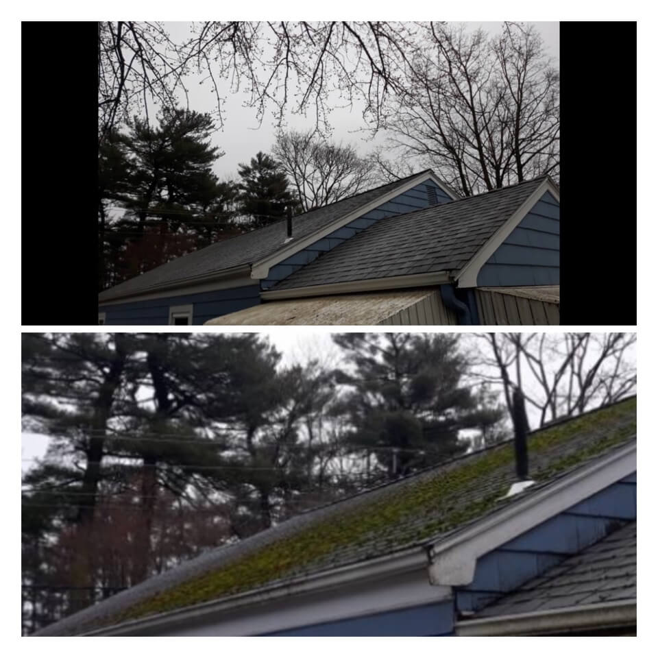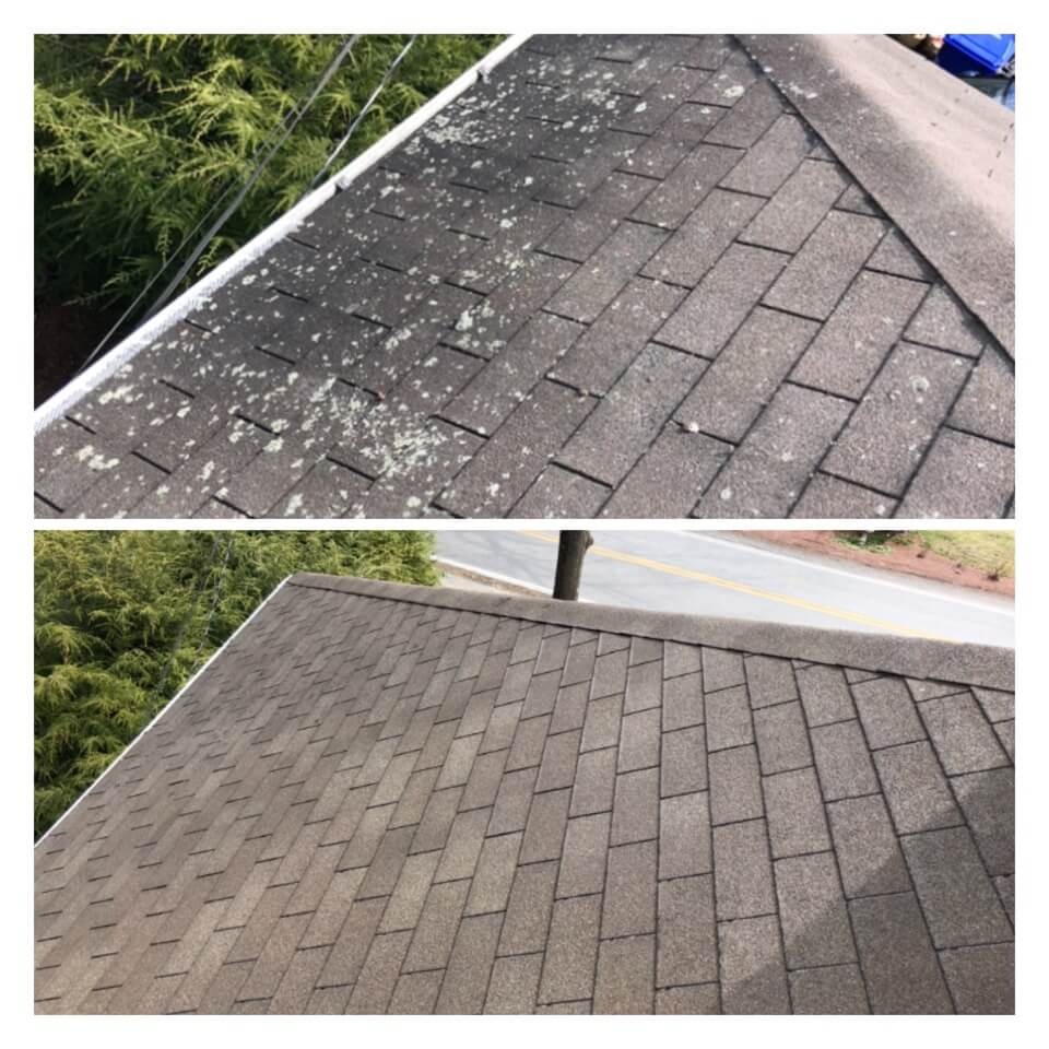 HiCleaners is the most experienced company in Milford, NH that deals with roof washing and roof soft washing. All of our employees are trained to recognize precise solution mixing ratios to provide you with the safest and most effective soft washing service. Roofs are a commonly neglected part of a house due to the fact that most people don’t have ladders to access it, so it is very easy to just leave it alone and forget about problems that may start to arise. Just like many home owners, discoloration and small bits of moss on a roof can be overlooked because of the misconception that it is just aesthetic. However, it isn’t just aesthetic, the moss slowly lifts the granules off the shingles which in turn shorten the life of the shingle. The moss also spreads, just like any bacteria if it is left alone for too long, it can quickly become a problem that spirals out of control. Call HiCleaners for a free quote, we only use the most advanced eco-friendly solutions and equipment to make sure the job is done right, for the safety of the employees, your plants, grass, pets, and children.